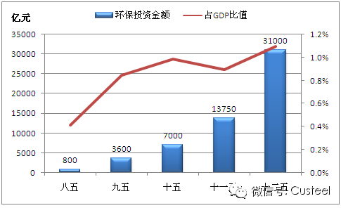 “十二五”期间国家环保投资出现了较大幅度增加,预计将达到31000亿元。实际上,从“八五”以来,环保投资便持续增加,占GDP总量的比例由0.4%上升到现在的1.1%,显示出环保态度的坚决。